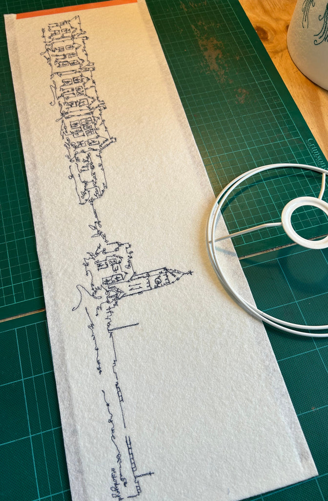 A freehand machine embroidered Porthleven lampshade. A neutral colour felt background using the colour stitch of your choice to stitch the Porthleven scene of Bay View Terrace and the Clock Tower.